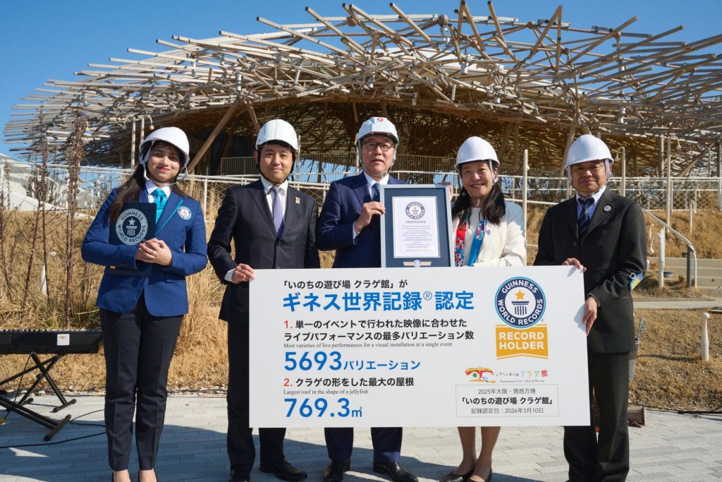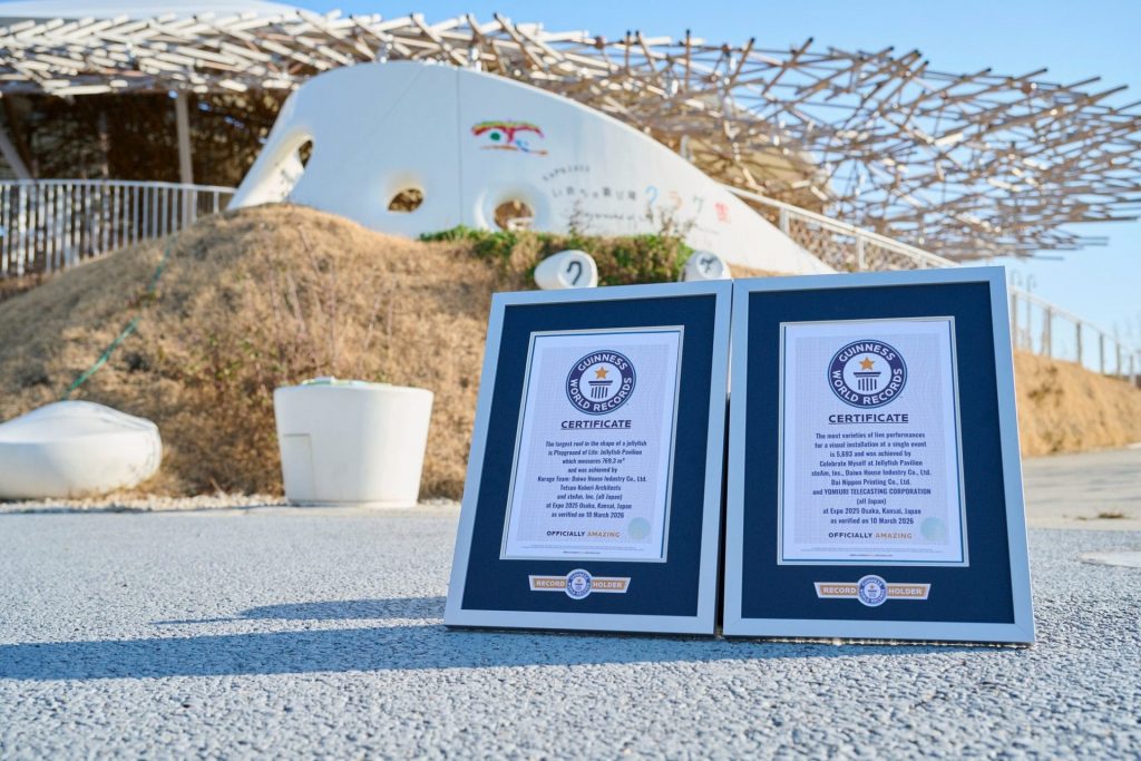 認定されたのは、「単一のイベントで行われた映像に合わせたライブパフォーマンスの最多バリエーション数」と「クラゲの形をした最大の屋根」。認定日は2026年3月10日。3月16日、解体直前のクラゲ館前で公式認定証授与式が行われた。