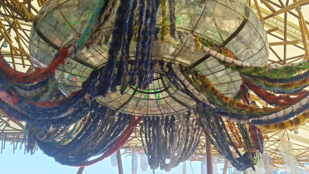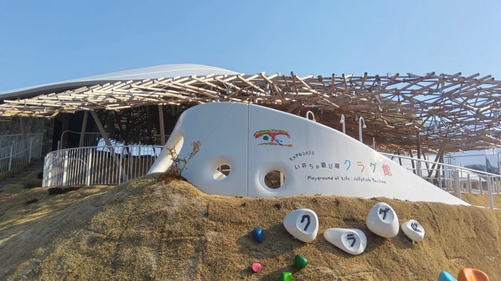 環境と循環を意識し、内と外を分断しない、常に変化し続ける“生き物のような場”という理念に基づき作られ、会期中約268万人の来館者を受け入れた。木材を多用し、延床面積は1634平方メートル、高さ約12メートル。半透明で、ゆらゆらと海を浮遊する”クラゲ”をモチーフとして膜を張った大きな屋根が特徴。軽量化を意識し、すべてユニット材として分解可能。解体しても転用できるようにした。
