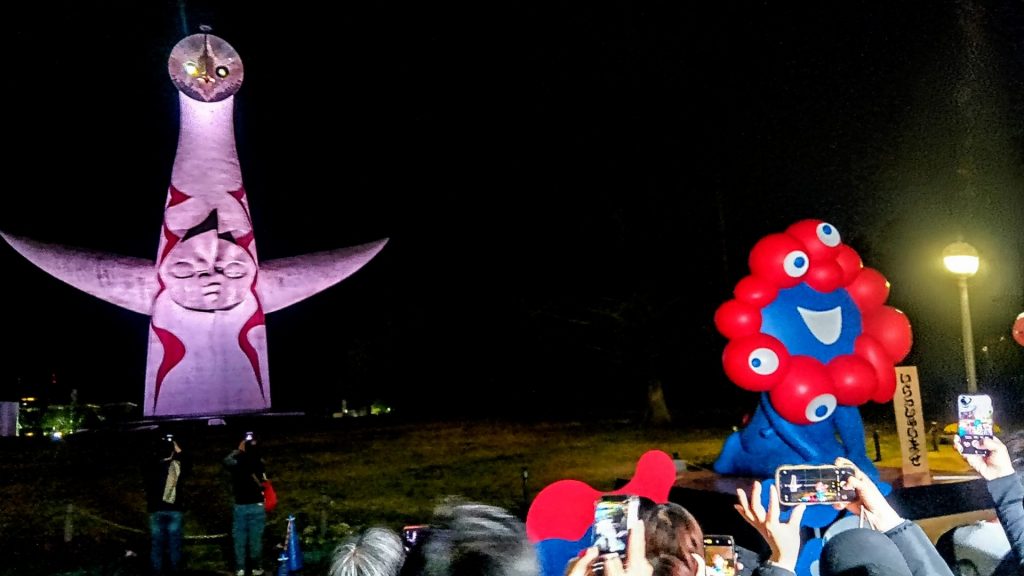 ドローン3000機による約15分間の飛行で、ラストシーンは、大屋根リングの上に立つ青と赤に彩られた公式キャラクター「ミャクミャク」が立体感あふれるデザインで登場、千里の夜空に広がった。