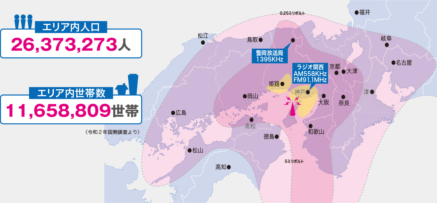 AM558/1395とFM91.1(黄色)の電波を通じて、兵庫県、大阪府を中心に近畿エリアの皆様にお届けしています。